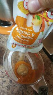 If you're only using one pouch (or if you aren't using any pouches and pureed fresh foods... go you! I used to but she knew what I was trying to pull), fill up the measuring cup with applesauce or some other pureed food until you have 1 and 1/4 cups of puree. Then add 1/4 cup of water (it thins it out a little, makes for a better consistency). You should have 1 and 1/2 cups in total.